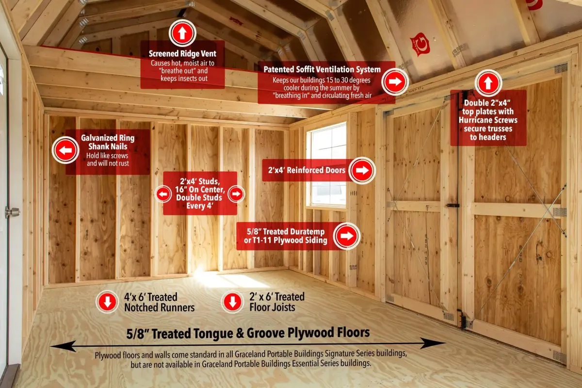 Plywood floors and walls come standard in all Graceland Portable Buildings Signature Series buildings but are not available in Graceland Portable Buildings Essential Series buildings.