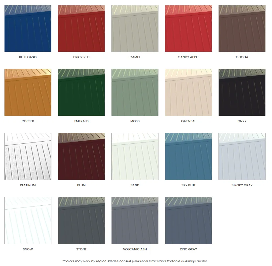 The color of your roof plays a significant role in the overall look of your shed. We offer a wide range of Graceland Exclusive Roof Colors and classic Shingle Colors to match any style.